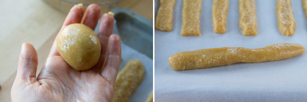 I found it easiest to roll the dough in between my hands and then shape it on the cookie sheet like this: