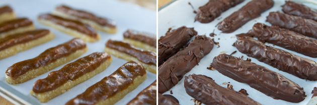 Shape the caramel as you did the cookies – roll between your hands into a long tube, then shape onto the top of the cookies. Try to make the sides flush with sides of the cookie.