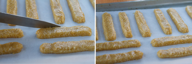 Once you have 3-inch sections, you can push the side of a knife up against them to make them nice and flat and even like so…