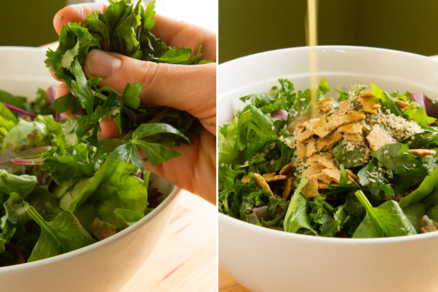 I wondered the same thing when I had it for the first time at One Lucky Duck in New York – a restaurant that goes against the dainty restaurant salad crowd. It was like magic on my taste buds – the lemon, healthy oils, fresh herbs… the… mint? Mint in a salad? Weird. Who else is totally boggled by this concept? I know that I was! But it works so perfectly here, I wouldn’t have it any other way.