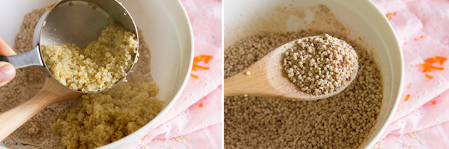 Add all dry ingredients to a large bowl. Then, measure 1 1/2 cups of the cooked quinoa and add to the dry ingredients. Stir to coat, until all quinoa granules are covered in the mixture. Set aside.