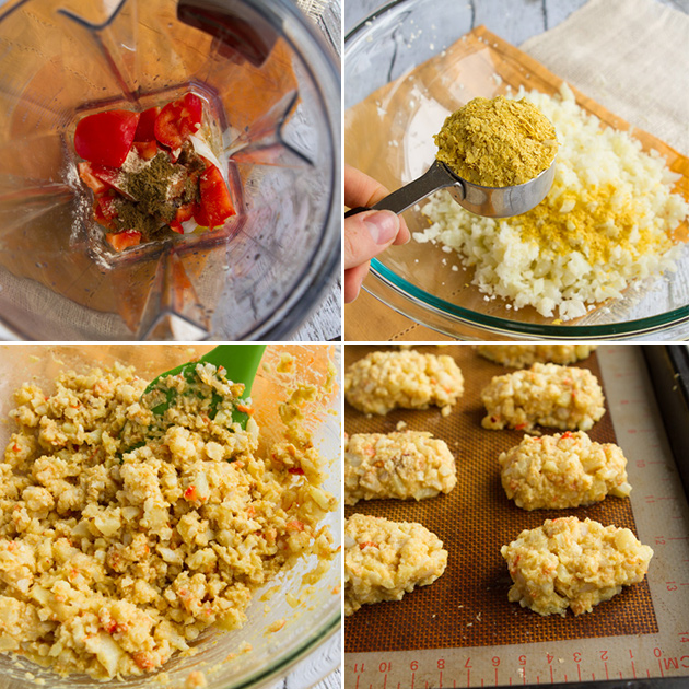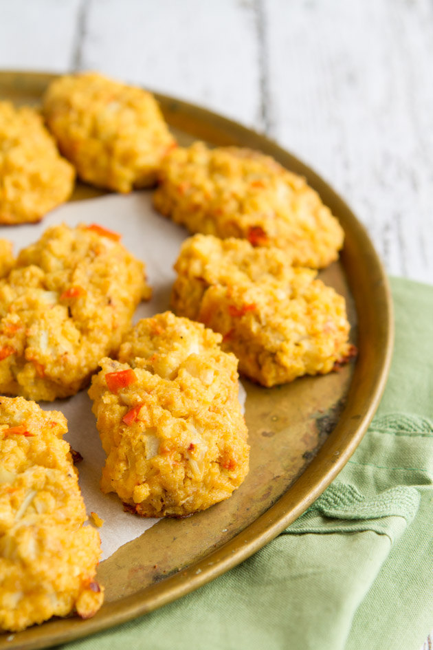 Crispy cauliflower tots packed with nacho cheese flavor without the dairy – a healthy alternative to deep-dried potato snacks.