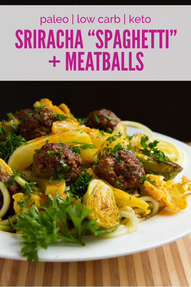 Mini keto meatballs tossed with roasted seasonal vegetables in a tangy keto sriracha sauce. Dropped over freshly spiralized zucchini noodles.