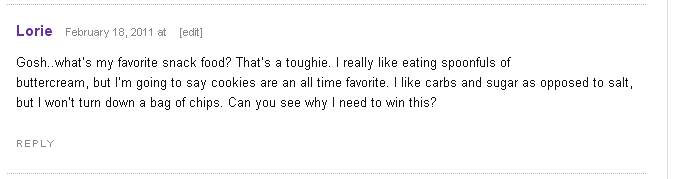 My favorite comment so far was from Lorie, it made me giggle while I was waiting for my lunch yesterday: