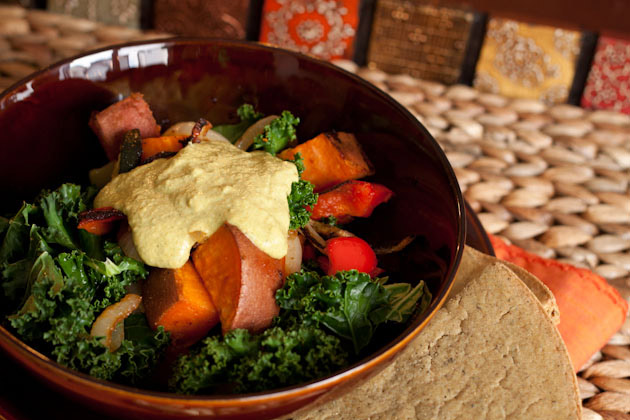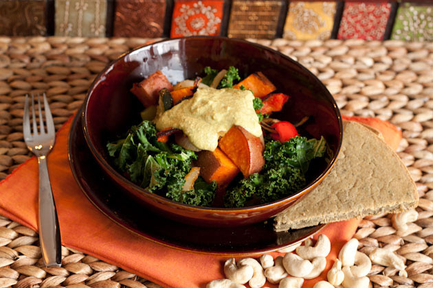 2. To make the veggies: preheat oven to 400F and combine all ingredients but kale on a baking sheet. Make sure to toss so that all veggies are coated in oil. Place in the oven for 35-40 minutes until sweet potato is soft. Add kale for the last 5 minutes of cooking.