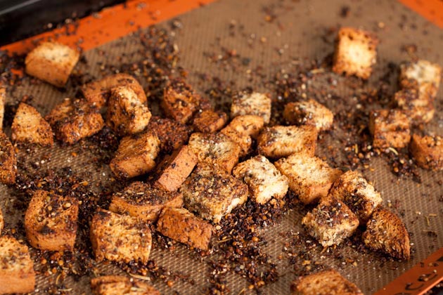 In a large bowl, add bread cubes then pour oil + herb mixture over top. Stir to coat.