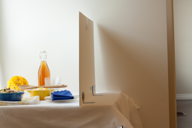 Left: diffusion panel (described below) | Back: particle board backdrop (purchased at any hardware store) | Right: foam board light reflector (described below)