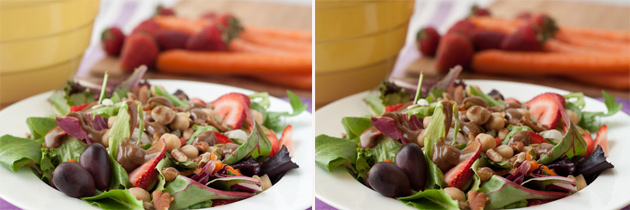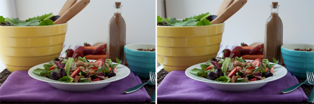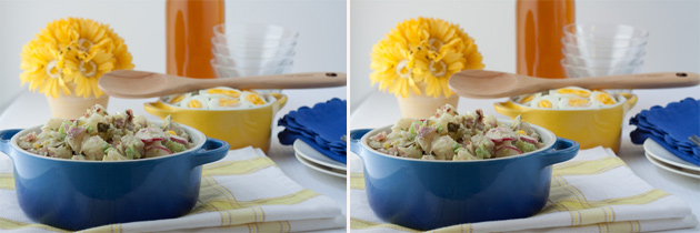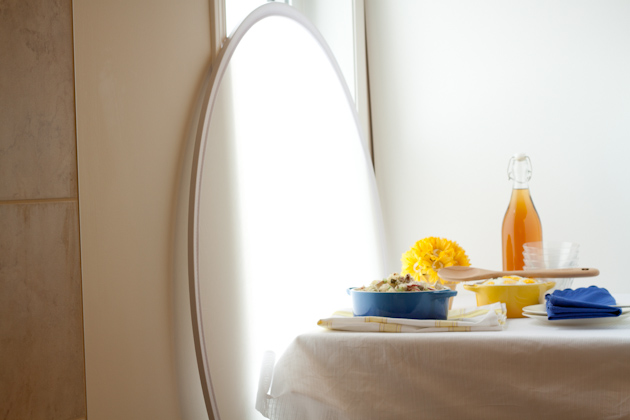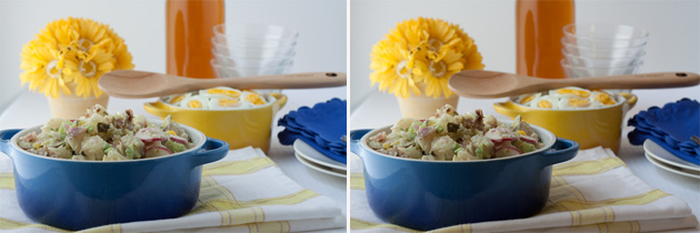 Again, left with reflector and right without it. Look at the blue napkin and the details of the salad in the blue casserole dish.
