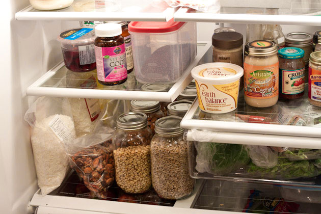 You’ll find condiments, a couple of old beers, and loads of fruits and veggies in our fridge. Our go-to condiments include: