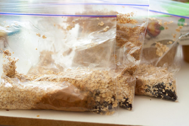 Bring along a 16oz. mini casserole dish. When ready to enjoy, combine mixture with 1 cup of hot water in the dish and allow to sit for 4 minutes before digging in. If you don’t have access to hot water, just combine the mix with ~200mL of non-dairy milk [like the rice or soy milk from above], let it sit for an hour, and you have yourself overnight oats.