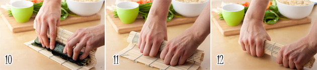12 ) Roll the mat around the California roll, lightly squeezing.