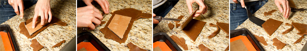 Once you’ve outlined the template, push away access dough with the knife, then remove the template. It may stick to the dough a bit, but don’t be alarmed. Just use some force, it’ll be fine. Lift the dough from the counter using a thin turner or spatula and place on the prepared pan.