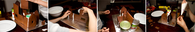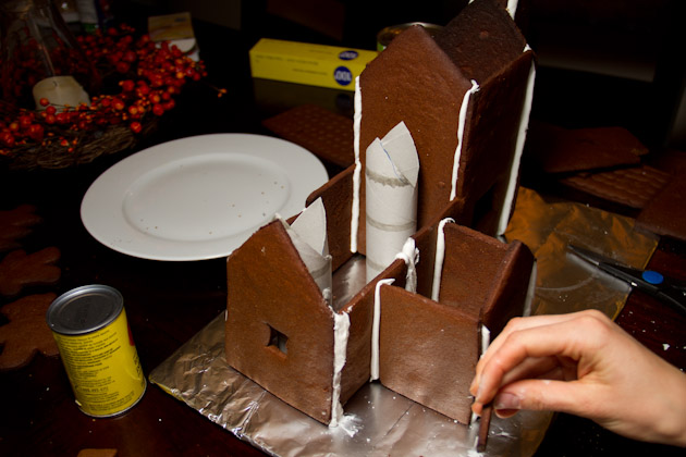 We used cans and other pantry items to hold the pieces as we were building, stopping every so often for a 15 minute break to give the house time to settle.