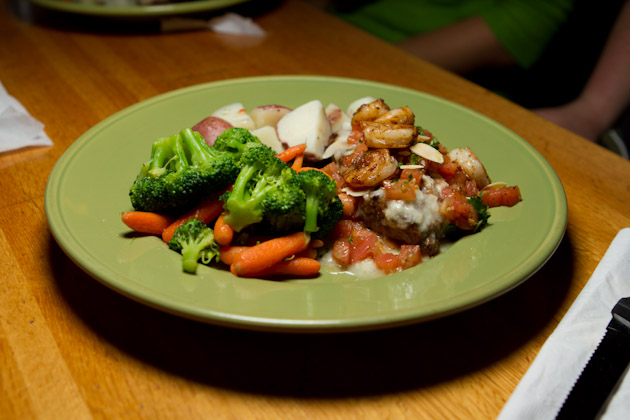 Shane ordered the signature sirloin with garlic herb shrimp, a 7 oz. sirloin topped with shrimp and cream sauce. It was love at first bite, he explained after he’d cleared his plate. The brocolli was steamed to perfection, the steak was cooked just the way he’d asked for it, and the cream sauce was great with the shrimp.