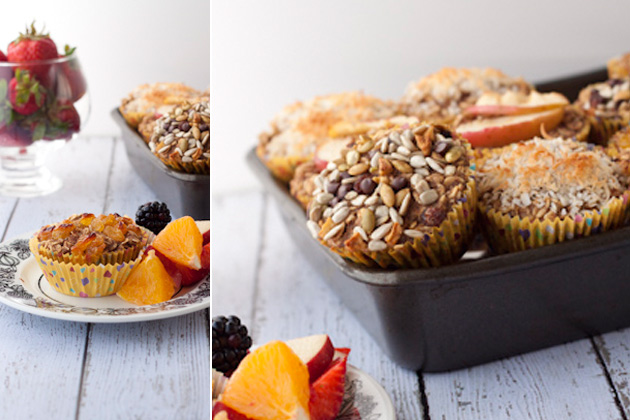 What we needed was a recipe that could be customized for the both of us, prepared ahead of time, and be eaten on the road if need be. When I saw this recipe for baked oatmeal cups with customized toppings on Pinterest, I knew that it could potentially mark the end of my rushed breakfast blues. With a little bit of tweaking, it had everything we needed in a breakfast!