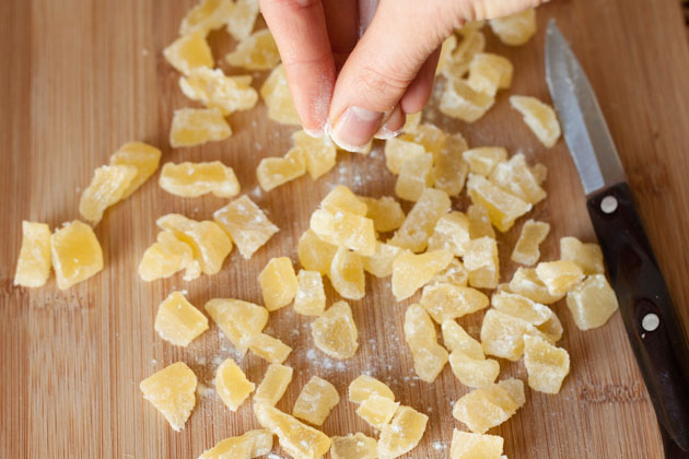 The pineapple and apricot pieces were too large, so I chopped them up and covered them in rice flour. Just a little is all you need and it instantly removes the stickiness so the ingredients wont clump together.