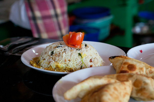 Biryani is a lot like fried rice, comes in vegetarian or meaty varieties, and is usually loaded with spice, sauce, veggies and oil.