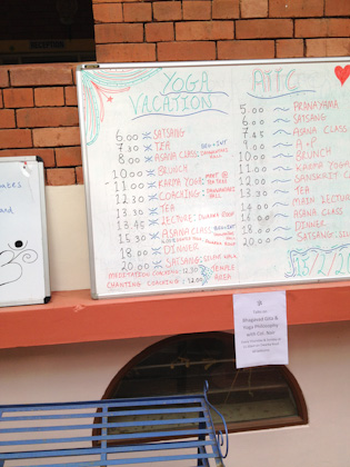 What was the schedule like? The following schedule was adhered to Saturday to Thursday, with a ‘day off’ on Friday. Friday schedule was similar, but with a combined beginner/intermediate asana classes.
