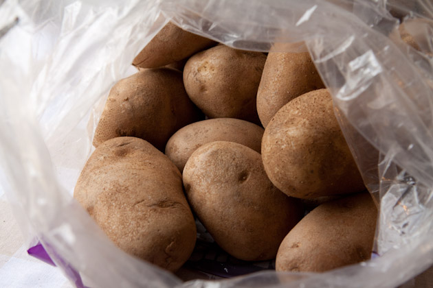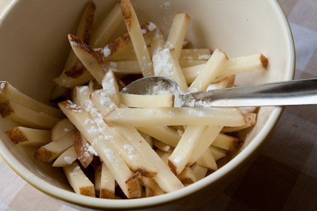 The first trick to the crispy fry is in using fresh potatoes. My favorite potato for making fries are the high starchy baking potatoes. They make nice long strands, too.