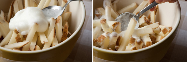 And the last trick is egg white. Toss your fries around a bit to make sure they’re all coated and Bob’s your uncle!