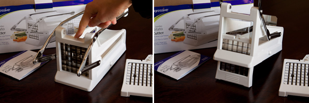 The machine comes with 2 inserts – one for thin fries, and the other for wedge fries. The pieces are removed by the press of a button, easy enough.
