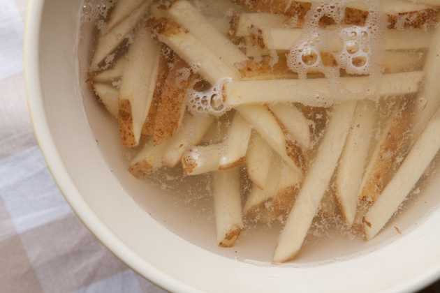The second trick is soaking the potatoes before cooking. A lot of people say to use warm water, but I find it makes the fries a bit sticky so I use cold water.