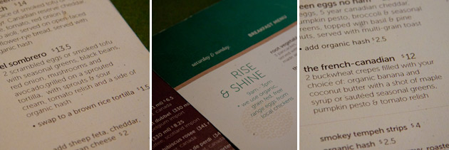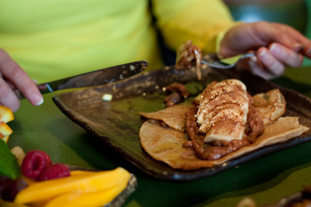 Yesterday I decided on the el sombrero – a brown rice quesadilla of sorts with eggs, black beans, avocado, onion and mushrooms with a side of organic hash. Shelby went for the French-Canadian – buckwheat crepes with coconut butter, banana and maple syrup with a side of fresh fruit.