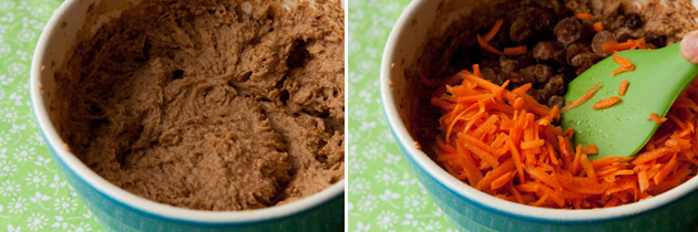 In two separate bowls, combined wet ingredients in one, and dry in the other. Be sure to give the dry ingredients a good whisk so that everything is fully combined.