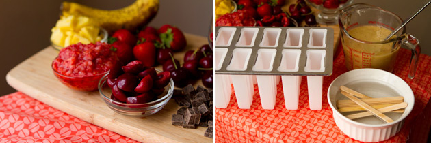 Get your ingredients ready – puree the bananas and milk, clean the blender, then pulse the strawberries. Chop the pineapple and pit the cherries. Feel free to place everything in separate bowls so you can have a group of little hands help you assemble the popsicles!
