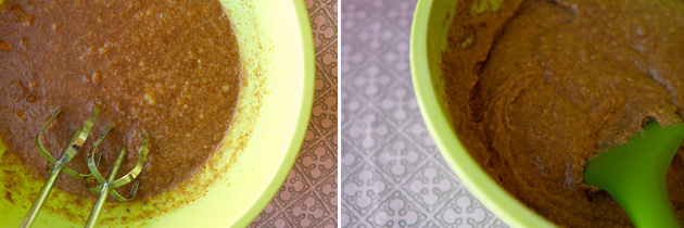 Begin by whisking all dry ingredients in a medium-sized bowl. Set aside and combine all wet ingredients in a large bowl.