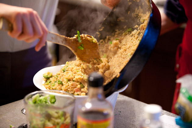 When you add your liquid, it should look like the first picture. Nice and hot, boiling, and cooking. Continue to move the rice around in the pan to prevent from burning.