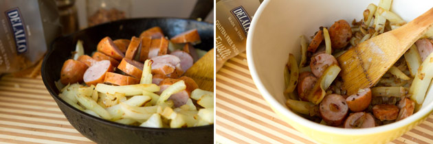 Add the sliced sausage, and move the mixture to a large mixing bowl.