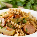 I’ve always thought that pasta salad should be reserved for Summer, but this salad with it’s smokey sausages and sauteed onions is anything but Summer. It’s warming, snuggle on the couch and watch a movie type of food. I don’t know about you, but that’s not an activity I enjoy in the Summer.