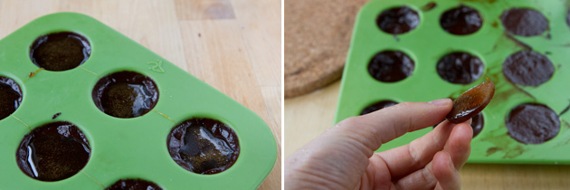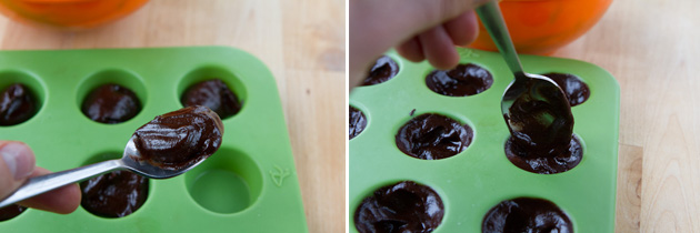 and spoon into a 12-cup mini silicon muffin pan. I purchased mine at Superstore for $1. I suppose you could use a chocolate mold too, but they’re a bit pricey.