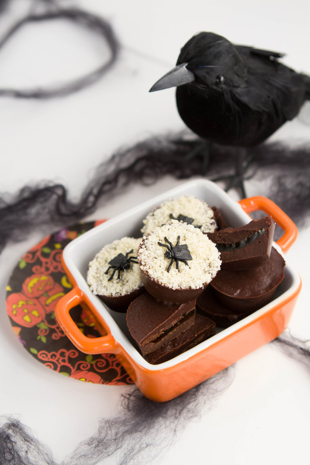 I made a couple of the cups with a creepy topping of almond flour and plastic flies for an added Halloween feel.
