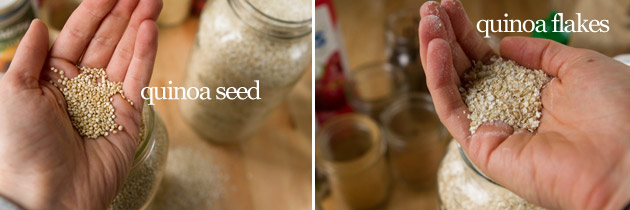 Quinoa flakes are crushed quinoa seeds. They’re a lot like quick oats but are gluten-free, grain-free and taste awful on their own. Ha… really, they do. But they work fabulously as a replacement for bread crumbs and are really good in quinoa flake bakes.