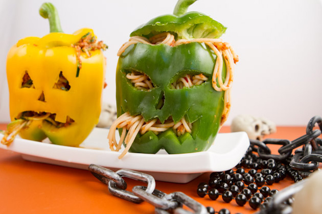 5. Divide pasta amongst prepared peppers and pull strands of pasta through the mouths or eyes of the jack-o-lanterns.