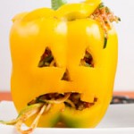 I was always resistant to eat, a bit to excited about the evening ahead I’m sure. But had I been presented with an opportunity to carve a bell pepper and stuff it full of spaghetti, I think I would have been a bit more thrilled about the whole Halloween dinner experience.