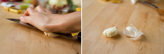 I’m sure you know the trick to peeling a garlic clove quickly and easily, but I had to share in hopes that maybe just one of you haven’t tried it this way! You place the garlic clove underneath a big/fat knife and press on the knife gently. All you need is to crush the clove, just a bit. Remove the knife and lift off the garlic shell.
