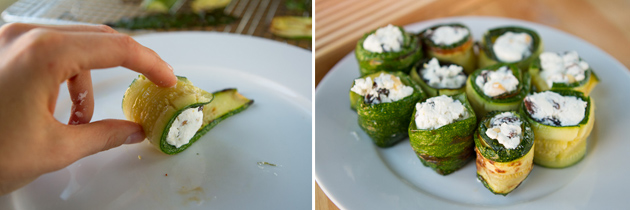 Once the zucchini strips have cooled, set a blob of the paste onto the larger end of the strip.