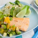A 15 minute meal complete with a fresh orange and avocado salsa, a fillet of moist salmon and lightly cooked bok choy.