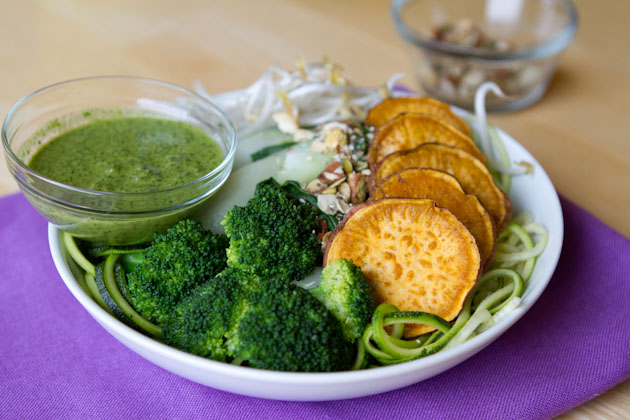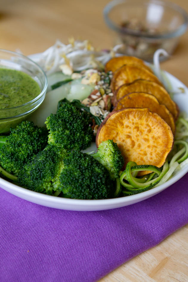 Angela made a beautiful adaptation of the Eat Your Greens Bowl (you can check out the recipe here) and I went for a slight twist on my Macro Greens Bowl, pumping it up with zucchini noodles, a delicious protein boost mixture, and extra green dressing.