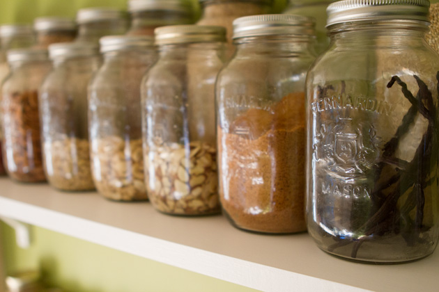 I chose really heavy duty anchors for the top shelf so that it could hold multiple large mason jars of items like quinoa, amaranth, teff, buckwheat, quinoa flakes, rice, rice flakes, coconut sugar, almonds, and pine nuts. Everything’s easy to spot and can be in my hand in seconds. No more rifling around looking for things!