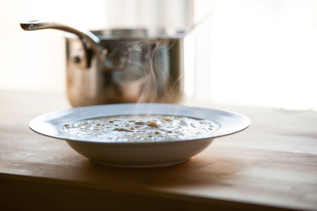 Puree the cauliflower mix, add it to the sauteed mushroom mix and stir. Place back on the heating element and cook until desired consistency is met. The longer you cook, the thicker it will be. We like ours really rich, so I simmered the soup for 10 minutes.