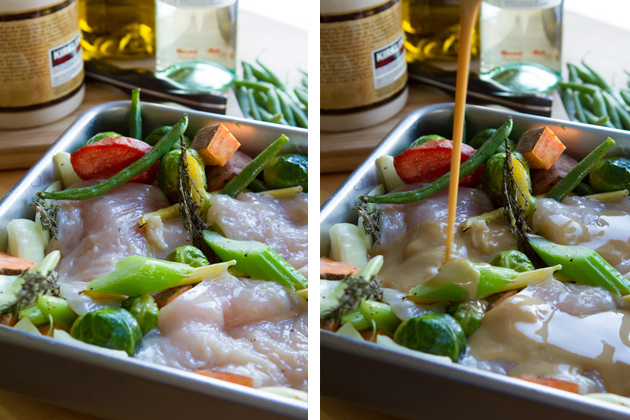 Once the veggies are done pre-roasting, you can add the chicken, add the sauce, mix it up together and roast it!