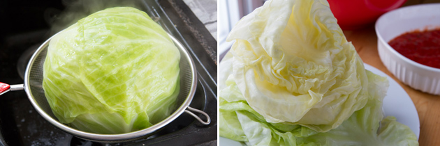 You’ll want to remove the core from the cabbage as I’ve show below. Once that’s done you can set that baby in boiling water and let it sit for awhile. Alternatively, some suggest throwing the cabbage in the freezer overnight then letting it thaw the following day. Had I planned this recipe far in advance I totally would have done that instead. But I didn’t so blanching was my method of choice.