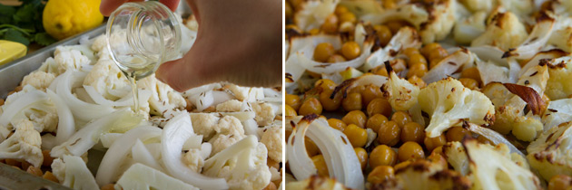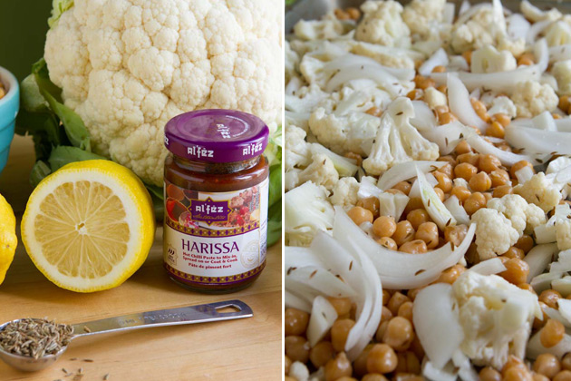 Preheat the oven, combine the cauliflower, onion, oil and cumin and roast those babies until they’re lightly blackened.