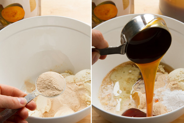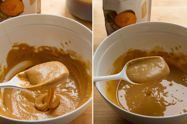 Mix thoroughly, then add boiling water. Stir completely. The batter should be quite runny as the picture on the right shows.