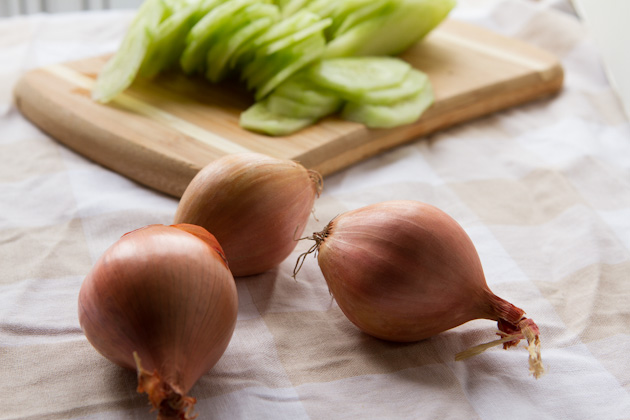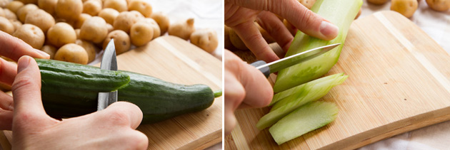 Meanwhile, remove the skin from the cucumber with a small sharp knife and slice into thin coins.