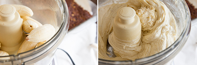 Meanwhile, place frozen bananas in the bowl of your food processor. Pulse, on high, until broken down and creamy, but still frozen. If your food processor is having a hard time with this, add a splash or two of non-dairy milk. Any kind will do the trick.